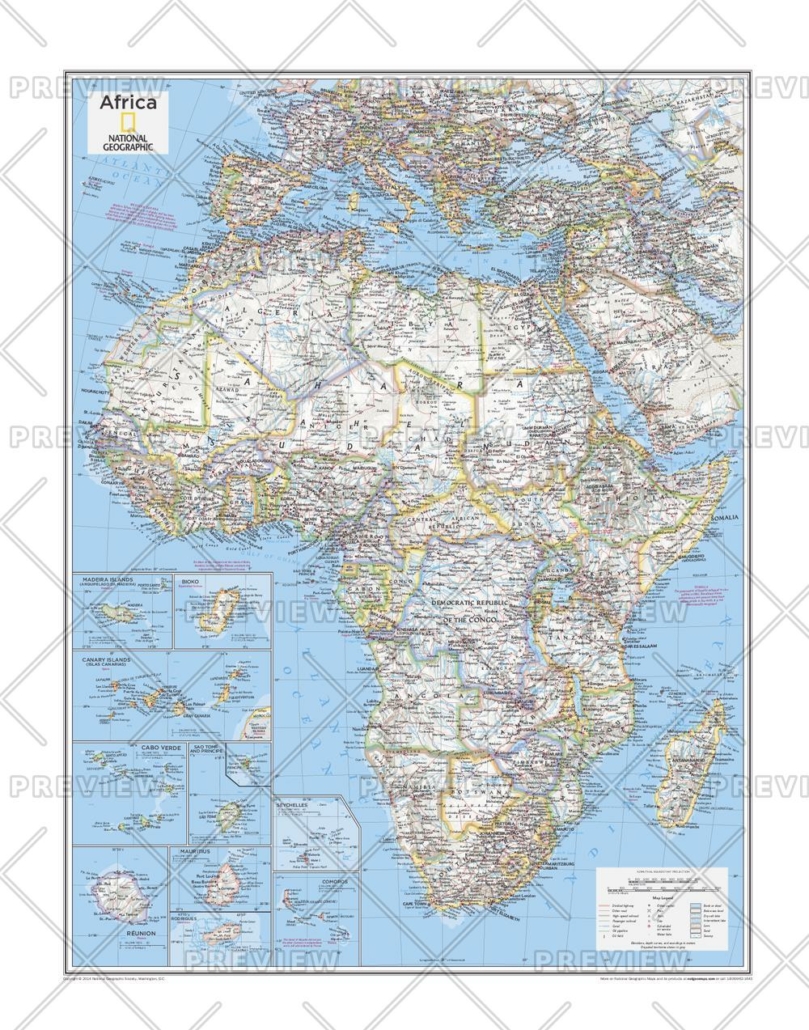Map of Africa by National Geographic. Measures 22″ x 28″. Printed on heavy-duty 46# paper and laminated with heavy-duty 3 mil laminate.