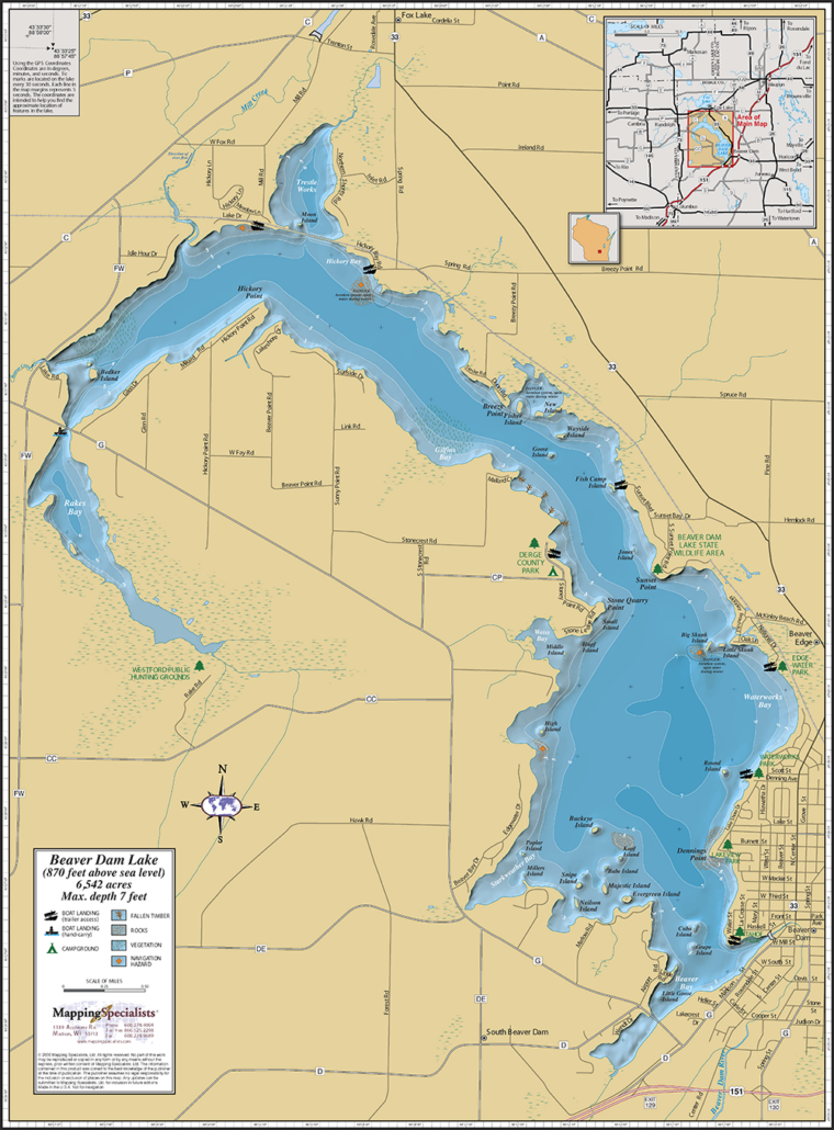 Wall map of Beaver Dam Lake in Dodge County, WI.