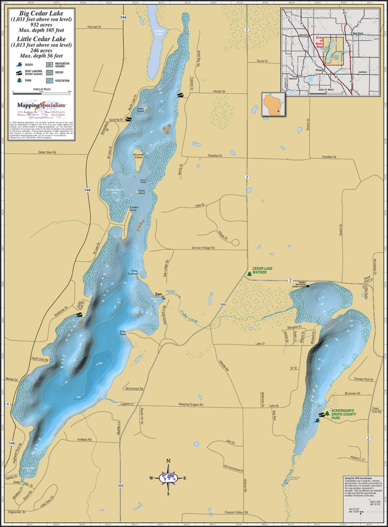 Fold map of Big & Little Cedar Lakes in Washington County, WI.