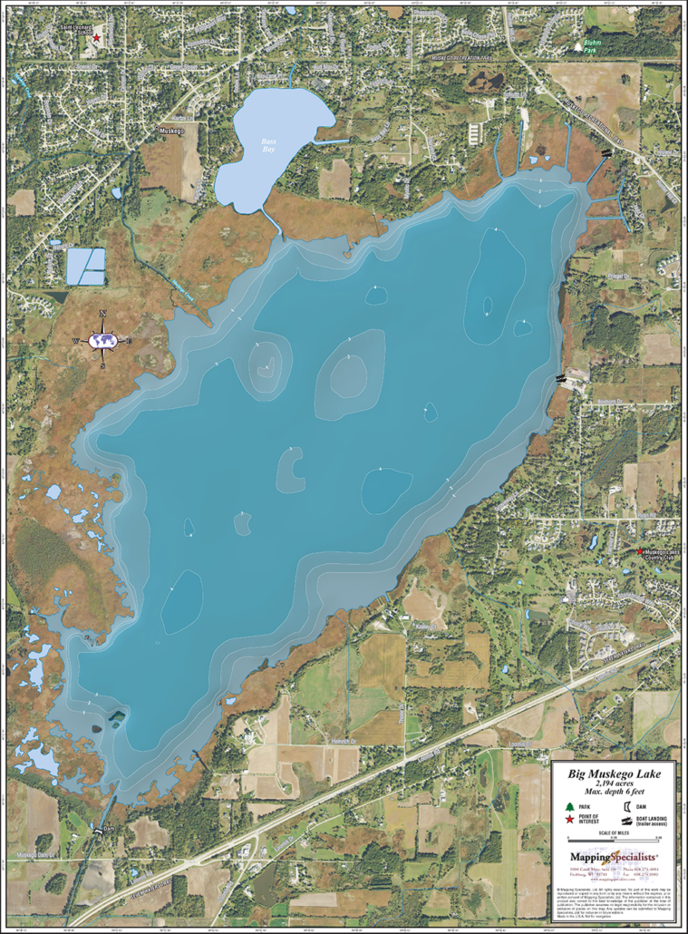 Enhanced wall map of Big Muskego Lake in Waukesha County, Wisconsin with aerial photography.