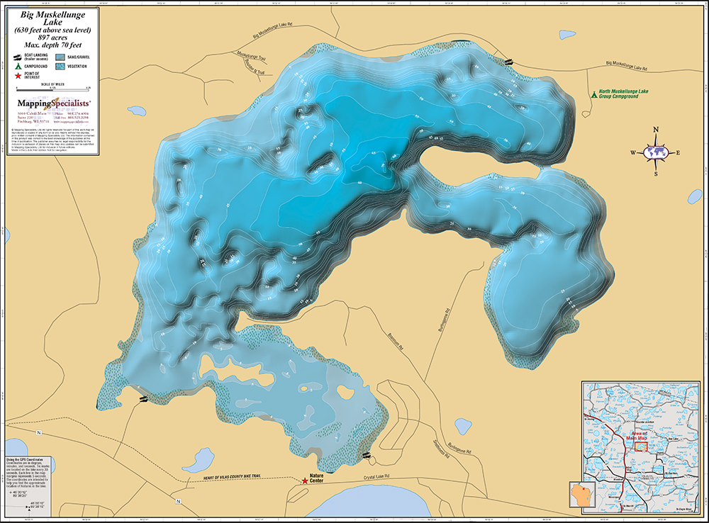 Wall map of Big Muskellunge Lake in Vilas County, WI.