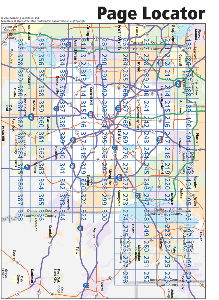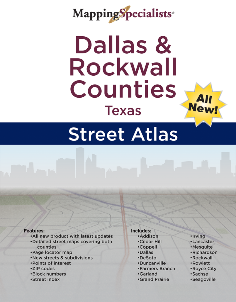 Detailed street maps of Dallas County and Rockwall County in Texas. Includes a full street index, as well as detailed maps of numerous suburbs. All new maps for 2023!