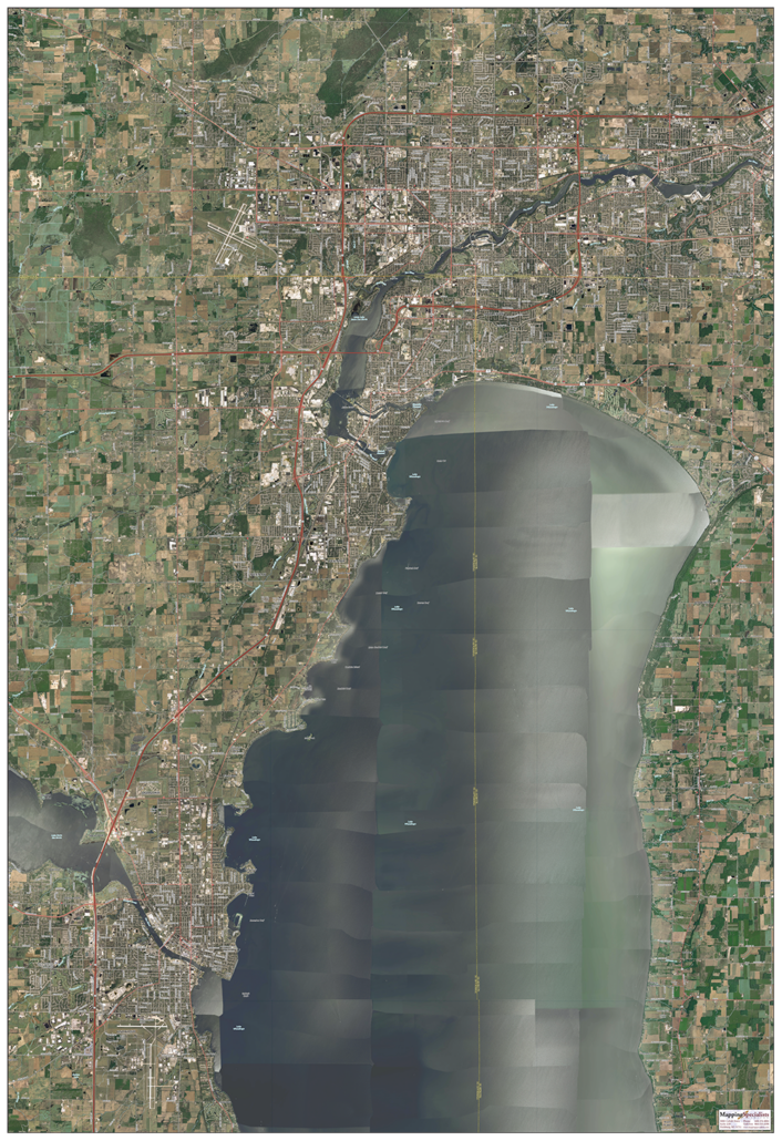 Topo Map of Fox Valley (Wisconsin) Metro Area with latest aerial photography. Includes Appleton, Oshkosh, Neenah, and Menasha. Measures 48″ x 70″.