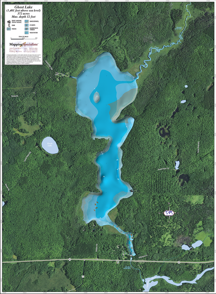 Enhanced wall map of Ghost Lake in Sawyer County, Wisconsin, with aerial imagery.