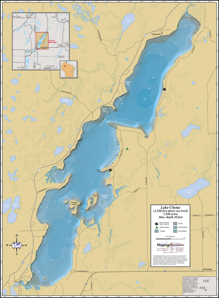 Wall map of Lake Chetac in Sawyer County, WI.