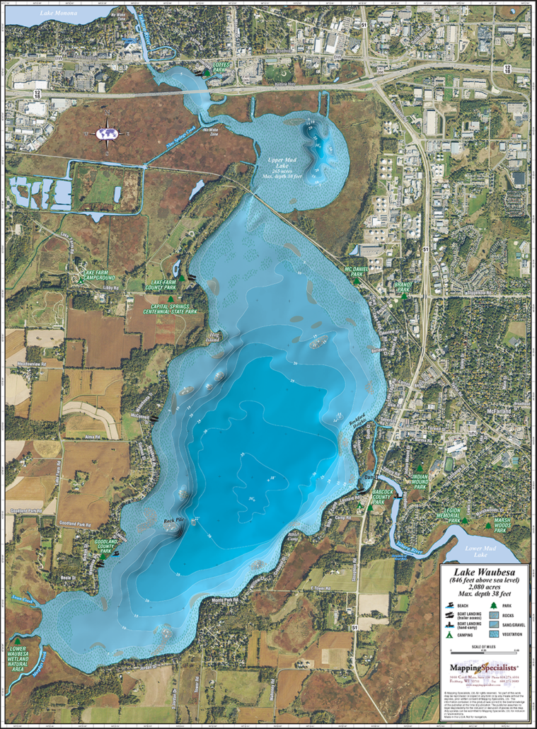 Enhanced wall map of Lake Waubesa in Dane County, Wisconsin with aerial photography.