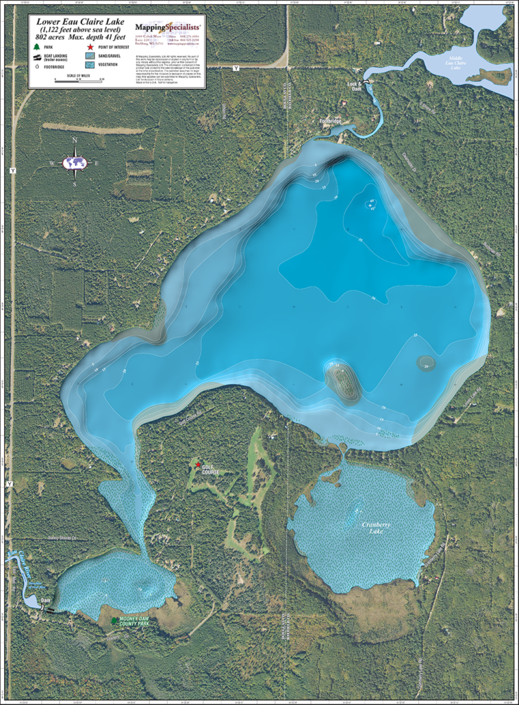 Enhanced wall map of Lower Eau Claire Lake in Bayfield County, WI with aerial photography.