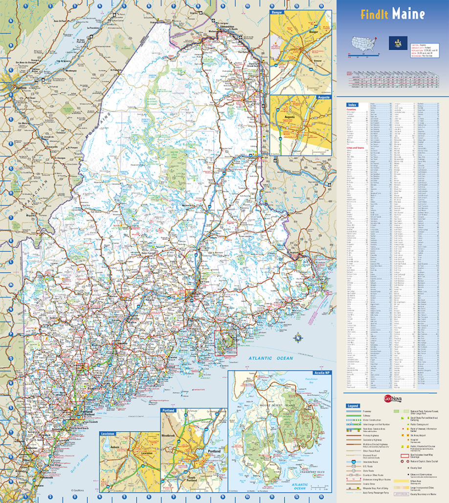 This colorful, easy-to-read state map of Maine identifies all major thoroughfares, secondary roads, freeway interchanges, rest areas, distance markers, landmarks, recreational areas, and more. Shaded relief on the state map provides a three-dimensional sense of Maine’s topography. Detailed city inset maps of Portland, Lewiston, Bangor, Augusta and Acadia National Park are based on the latest street information from GeoNova’s cartographic experts. County and city indexes make it simple to locate even the smallest town.