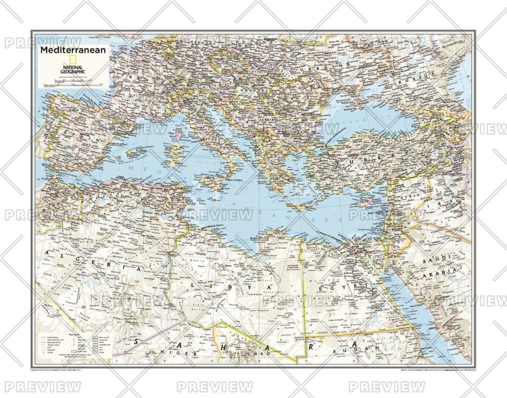 Map of the Mediterranean Region by National Geographic. Measures 28″ x 22″. Printed on heavy-duty 46# paper and laminated with heavy-duty 3 mil laminate.