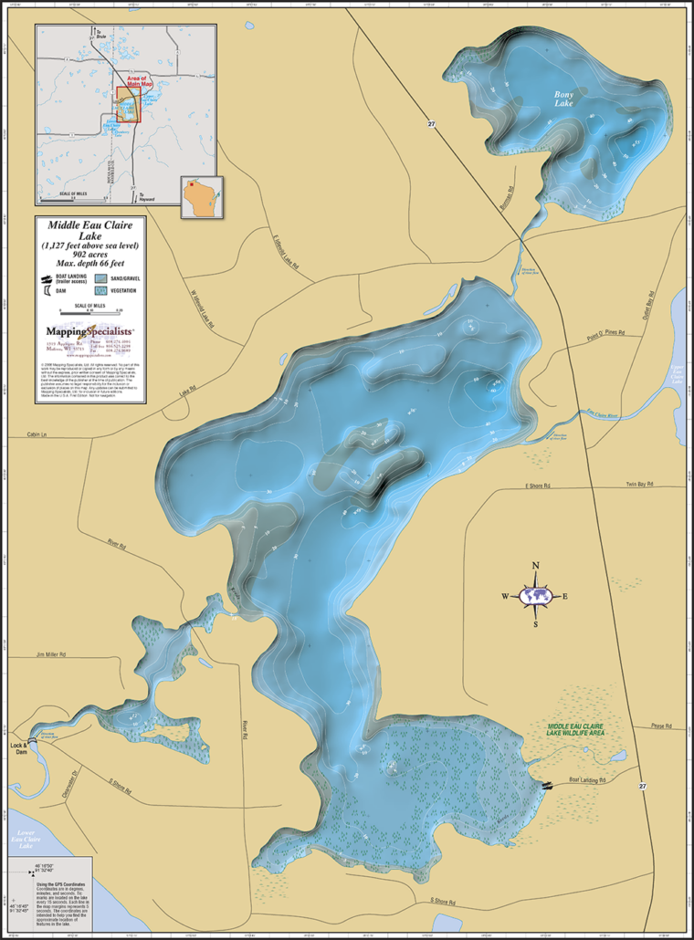 Wall map of Middle Eau Claire Lake in Bayfield County, WI.