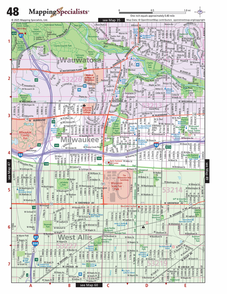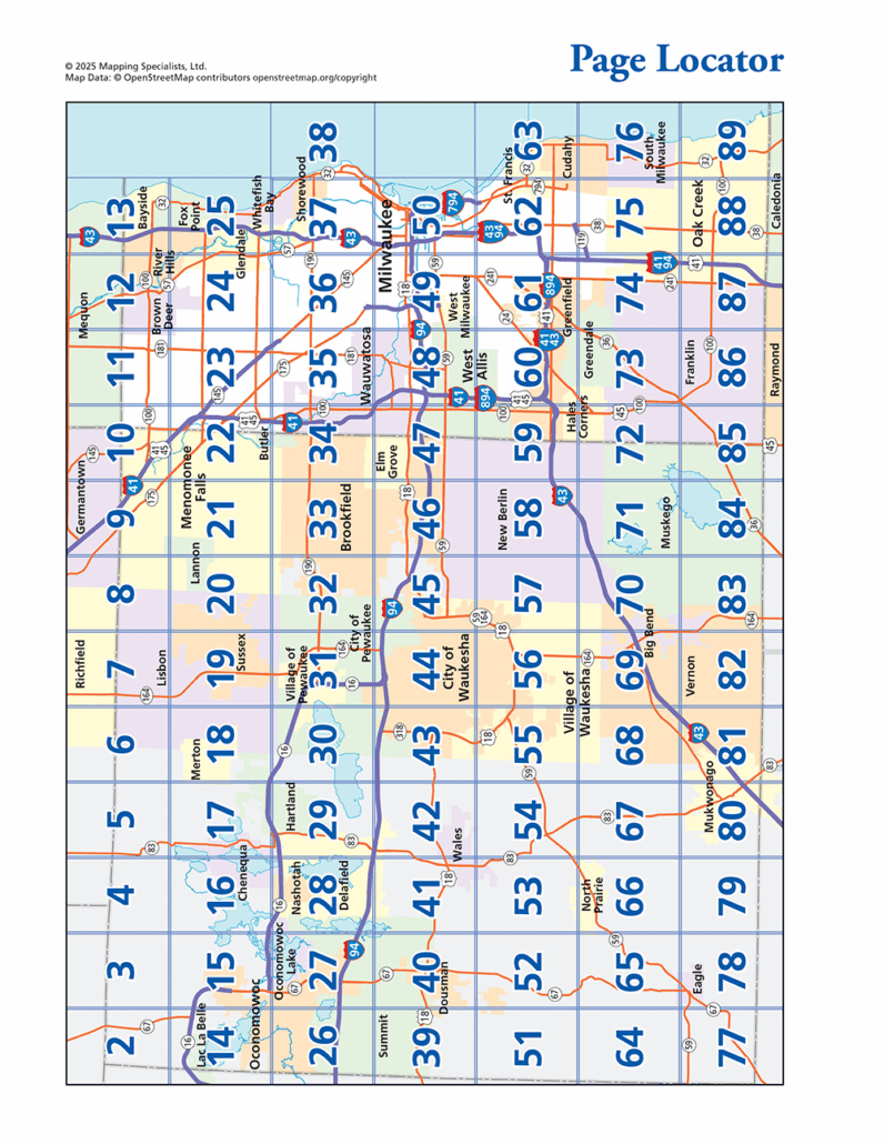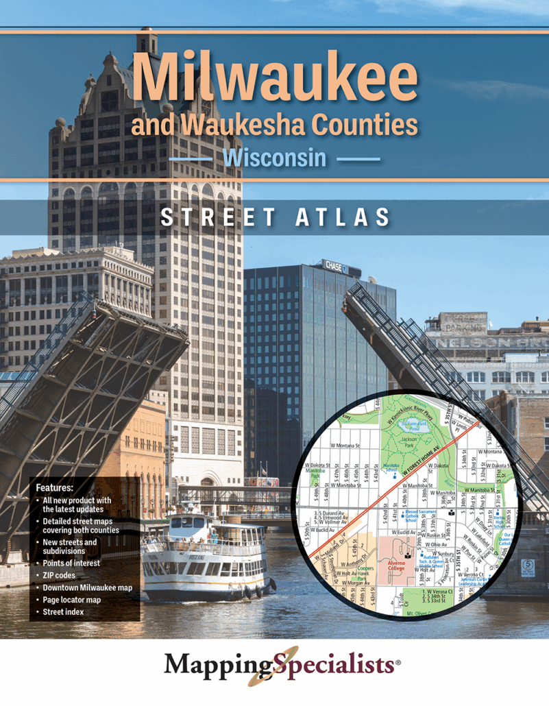 Detailed street maps of Milwaukee & Waukesha Counties. Includes a full street index, as well as detailed maps of all communities in these counties. All newly produced maps for 2025!