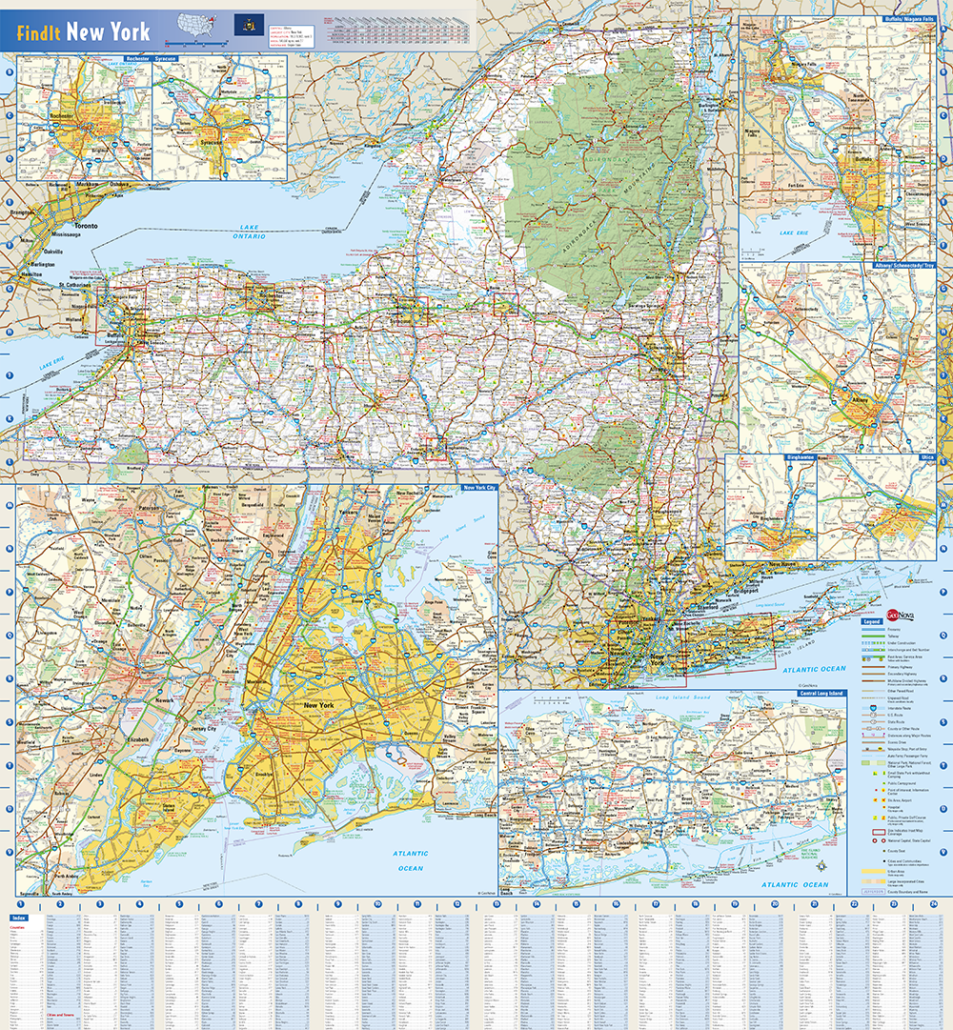 This colorful, easy-to-read state map of New York identifies all major thoroughfares, secondary roads, freeway interchanges, rest areas, distance markers, landmarks, recreational areas, and more. Shaded relief on the state map provides a three-dimensional sense of New York’s topography. Detailed city inset maps of New York City, Central Long Island, Buffalo / Niagara Falls, Albany / Schnectady / Troy, Rochester, Syracuse, Binghamton and Utica are based on the latest street information from GeoNova’s cartographic experts. County and city indices make it simple to locate even the smallest town.