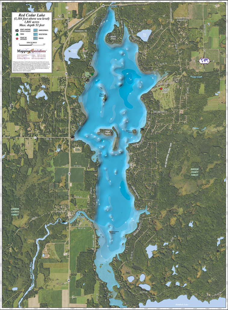 Enhanced wall map of Red Cedar Lake in Barron County, Wisconsin, with aerial imagery.