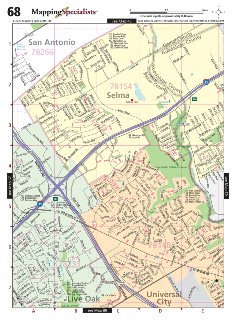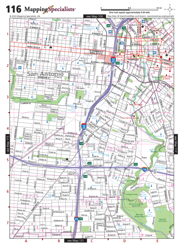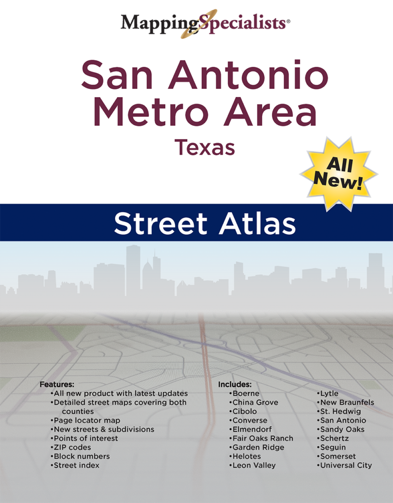 Detailed street maps of the San Antonio Metro Area in Texas. Includes a full street index, as well as detailed maps of numerous suburbs. All new maps for 2023!