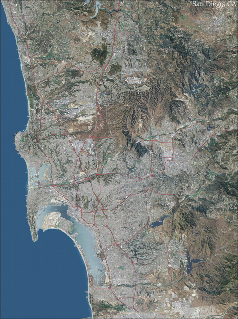 Topo Map of San Diego, California with latest aerial photography. Measures 60″ x 80″.