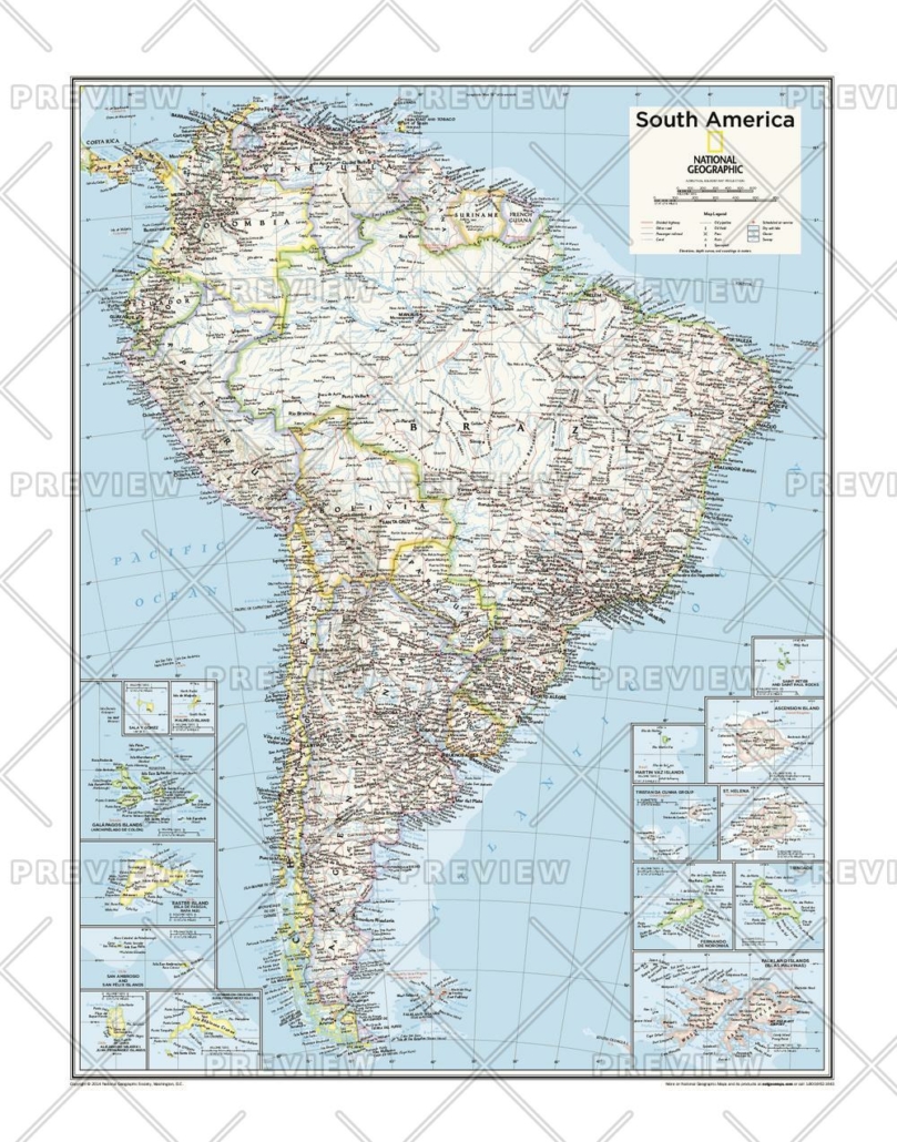 Map of South America by National Geographic. Measures 22″ x 28″. Printed on heavy-duty 46# paper and laminated with heavy-duty 3 mil laminate.