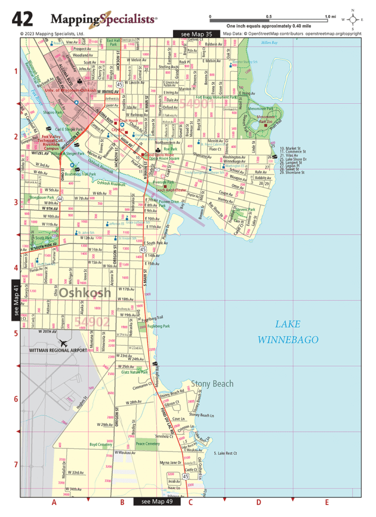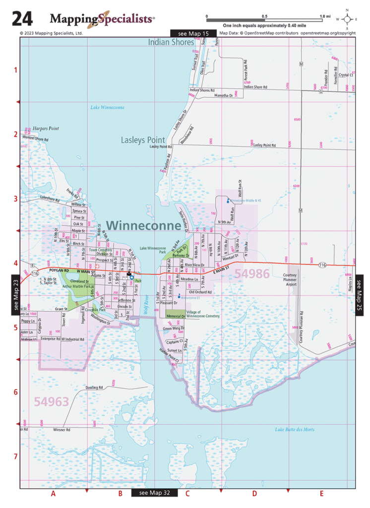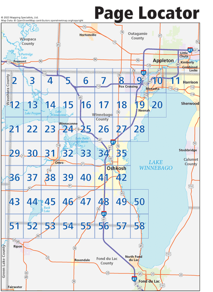 Detailed street maps of Winnebago County in Wisconsin. Includes a full street index, as well as detailed maps of numerous cities, including Oshkosh, Neenah, Menasha, Fox Crossing, Omro, and Winneconne. All new maps for 2023!
