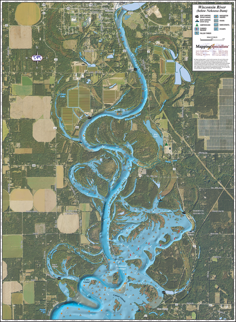 Enhanced wall map of Wisconsin River below Nekoosa Dam in Wood County, Wisconsin, with aerial imagery.