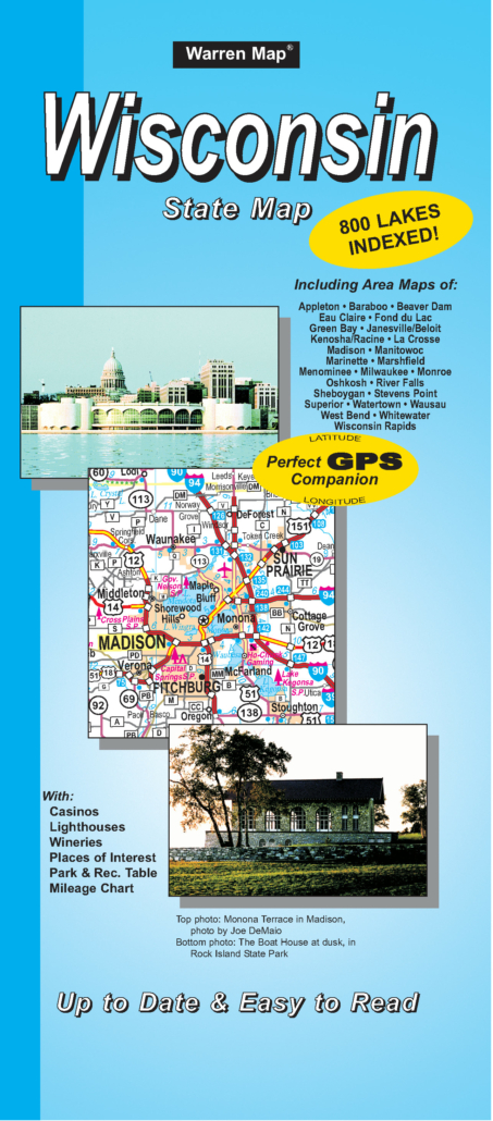 The Warren Map production of the Wisconsin State Map is an newly updated product with all the information you will need to travel around the Badger State. The map shows the state of Wisconsin with cities and highways and a city index on one side and city inset maps on the back. It folds out to approximately 25″ x 38″. It was printed in 2017.